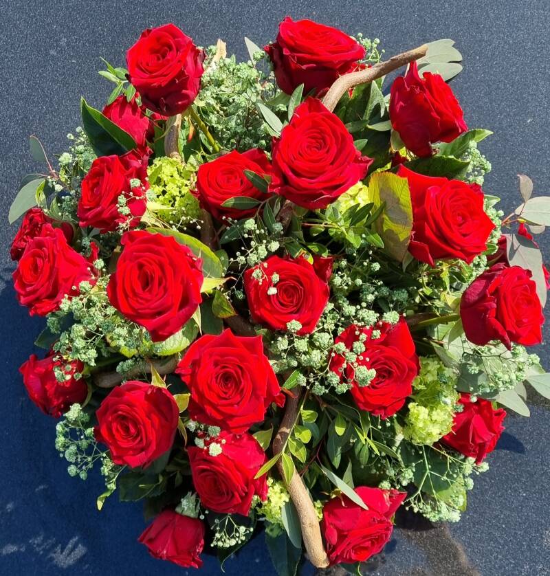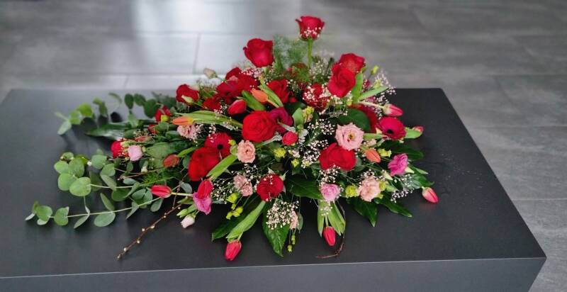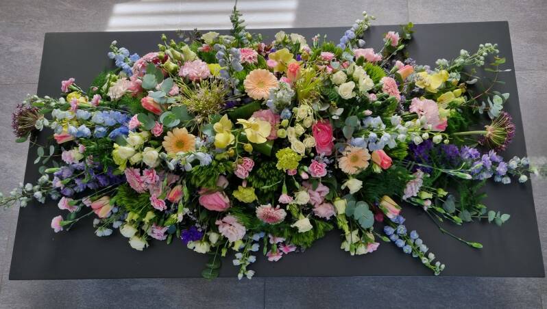 Afscheidsbloemen naast de kist